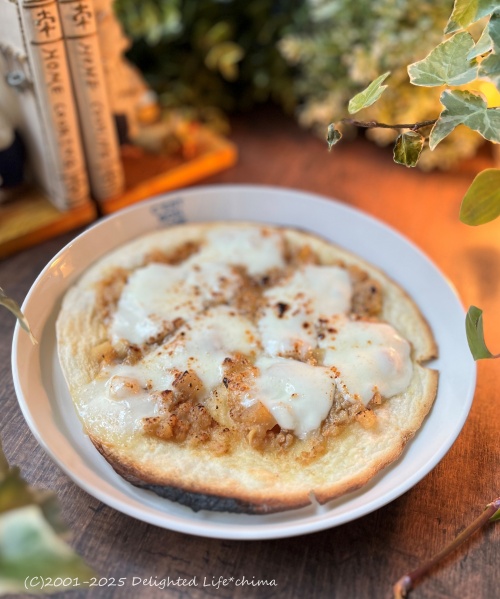 チキンとジャガイモ、たまねぎの具だくさんに生姜が効いた醤油ベースの和風ピザ。