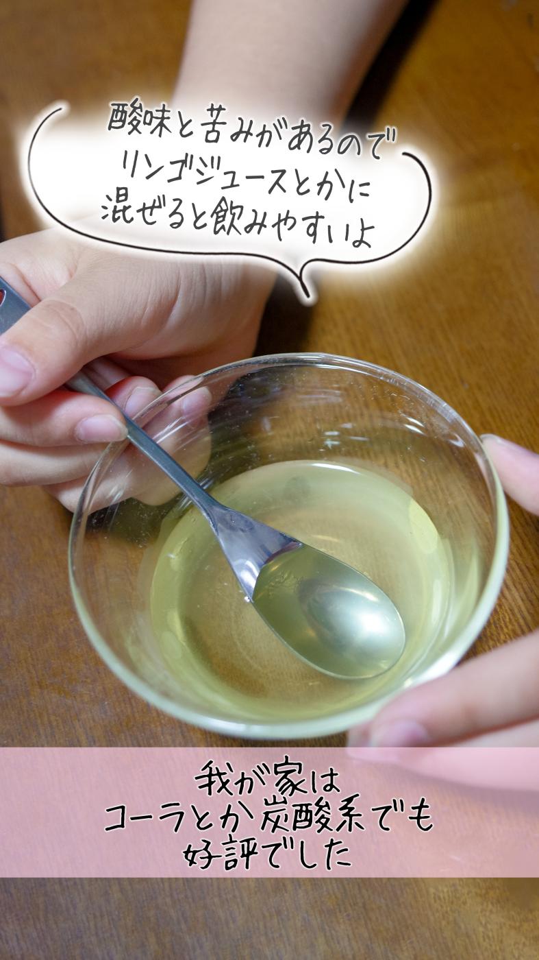 クエン酸の酸味を加えると少し飲みやすくなる…らしいのですが、原液はなかなかヘビー。