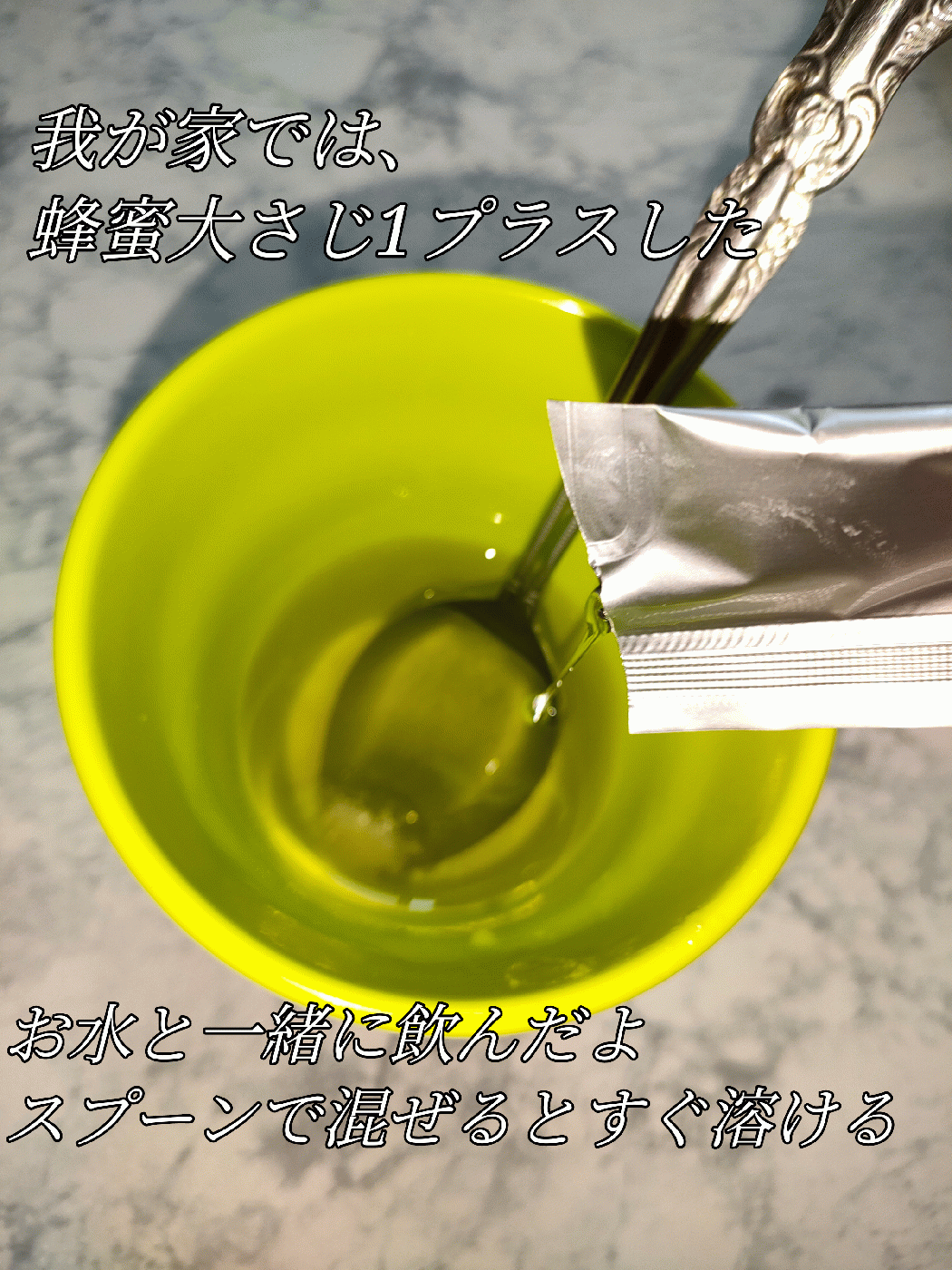 息子は、ハチミツ大さじ1と水100mlを混ぜると「スポーツ飲料みたいで美味しく、飲みやすい」との事です