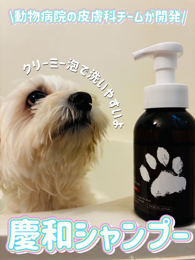 ということで愛犬用のシャンプーに1番求めているのは、やさしさ!!しっかり汚れを落としつつ、肌にやさしいものを選ぶようにしています。今回使っている【慶和シャンプー】は動物病院の皮膚科チームが開発しているものです。