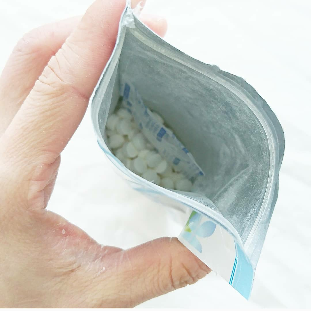 錠剤はまるでお菓子のラムネみたいなコロンとした形状で粉っぽい感じかな。手に取ると少し白い粉がつきます。