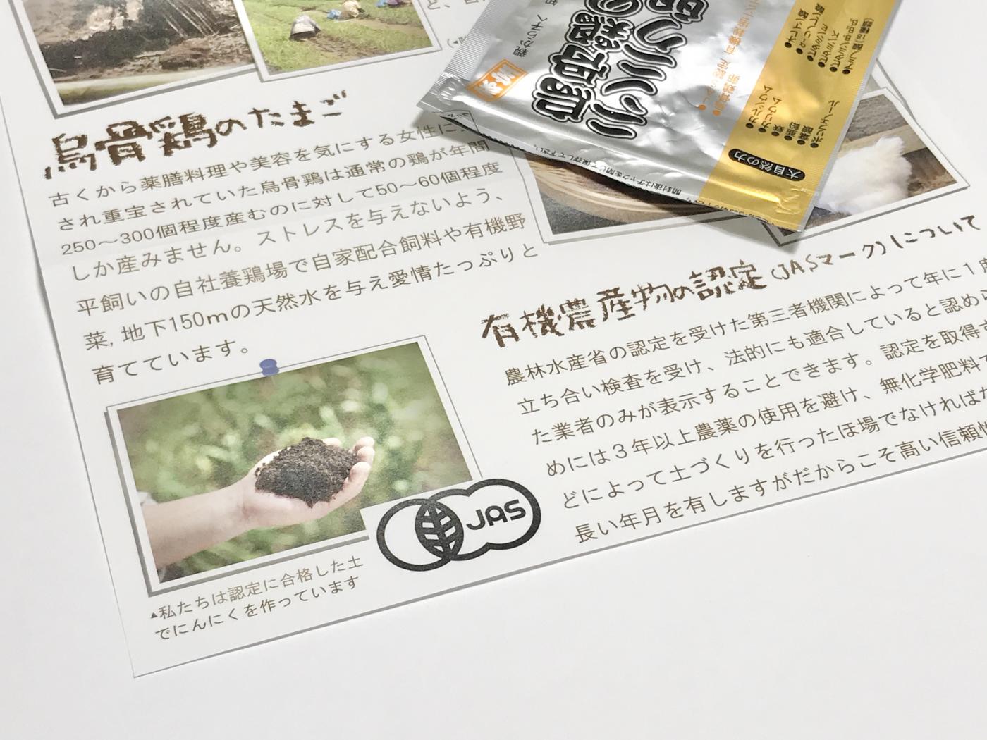 〝自社農場で生産管理したJAS認定有機栽培にんにくと烏骨鶏卵のみを使用。