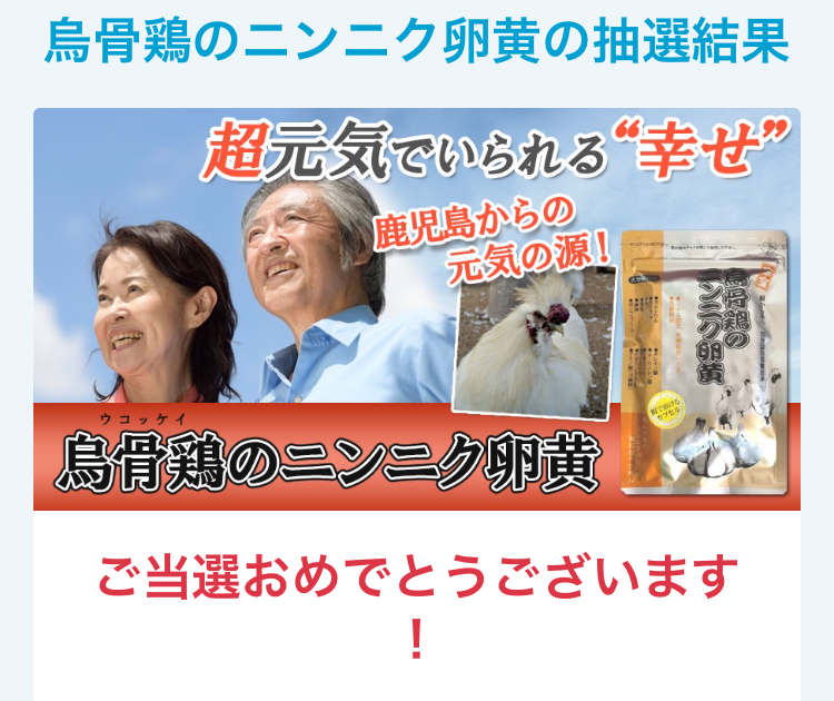 今回またまた当選ありがとうございました。 烏骨鶏のにんにく卵黄届いて飲み始めてすごく身体の調子が ...