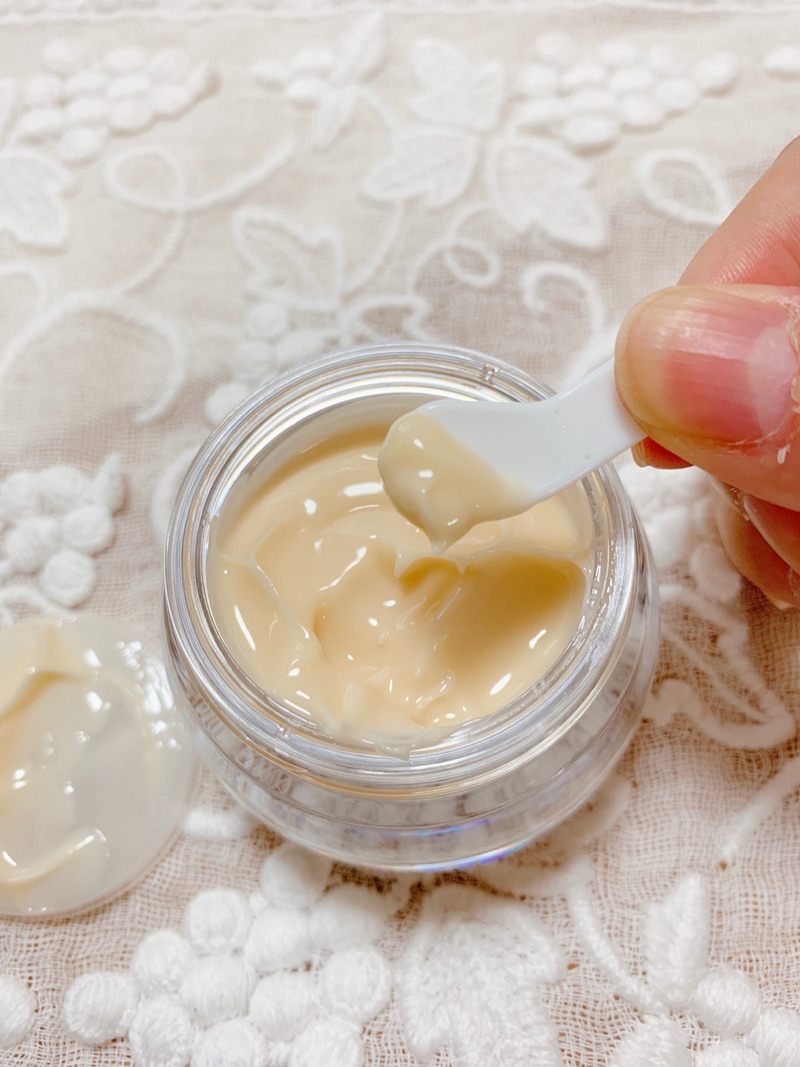 クリームをパール一粒分ほど取り額や目頭、あごなどにつけ顔全体伸ばし、マッサージするとパール一粒程でも充分に伸びが良く、保湿力も抜群!!