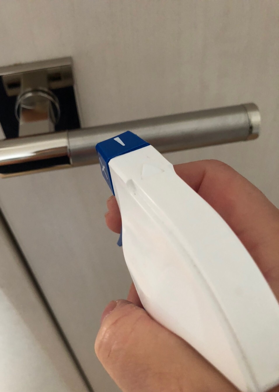 シュシュッと手指の除菌やドアノブ、テーブルにもスプレーしています。