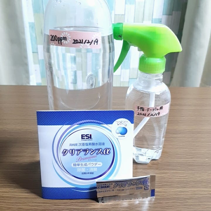 個包装になっており、こちらを1Lの水で希釈するだけで200ppmの濃度の高純度な次亜塩素酸水溶液が完成します。