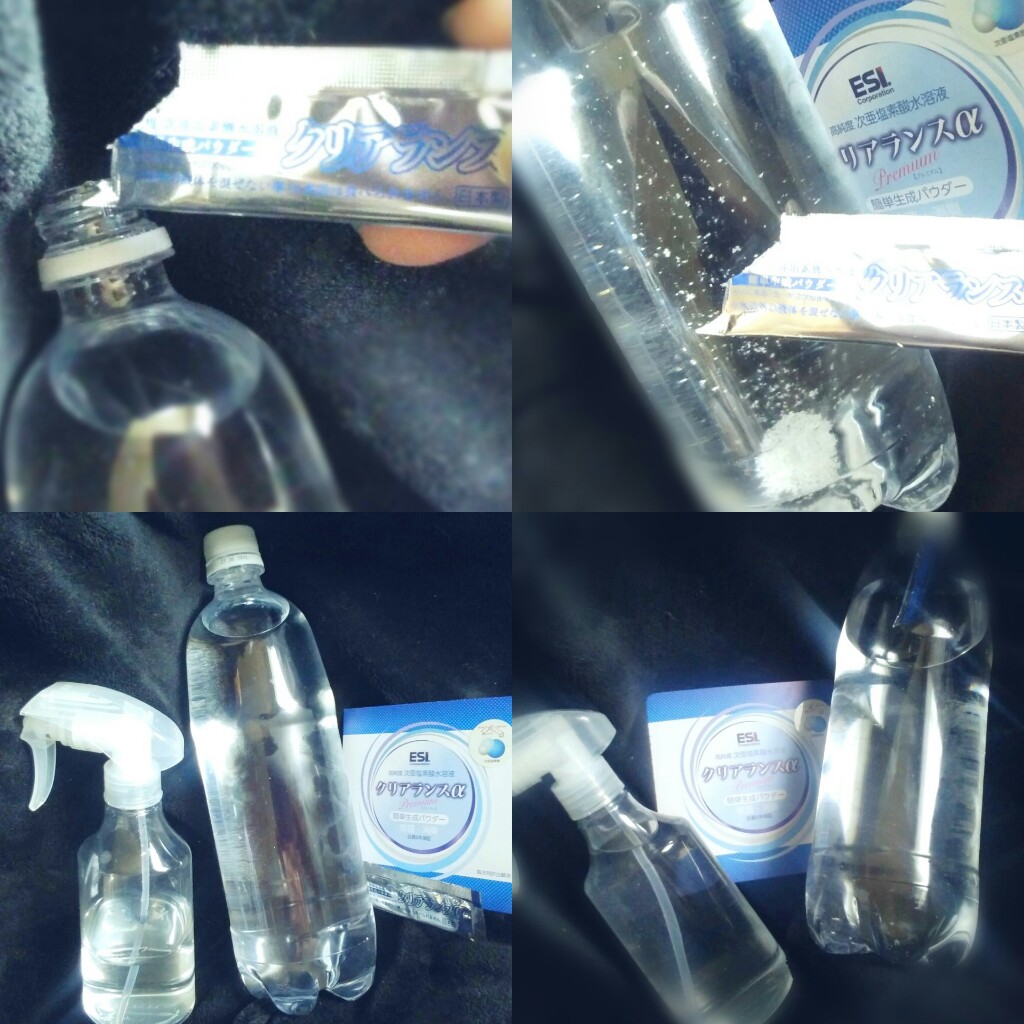 私は基本的には、室内の除菌消臭や猫用のものの除菌消臭に使います。濃度の目安、50ppm〜100ppmにしたいので、先程作った200ppm濃度の次亜塩素酸水溶液を水を半分くらいまで入れたスプレーボトルにいれて使ってます。(1週間くらいでつかいきるのが良いそうです)