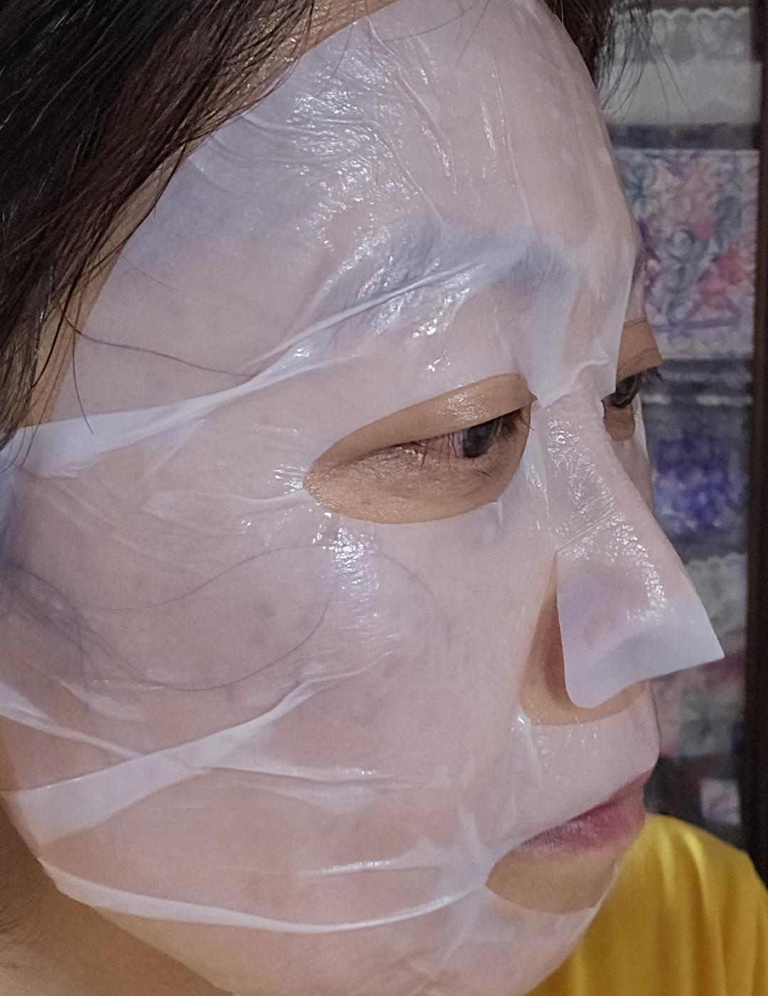 フェイスマスクは、しっかりたっぷりの美容液でしかも両側にシートついていてなんかマスク守られている感じ。