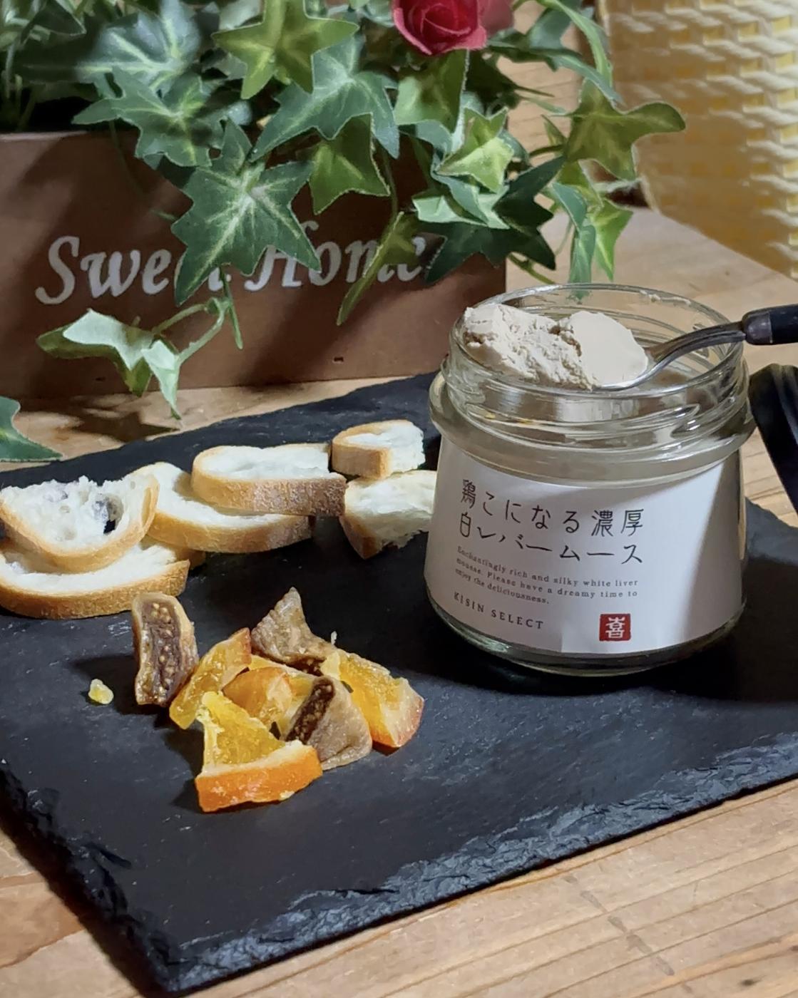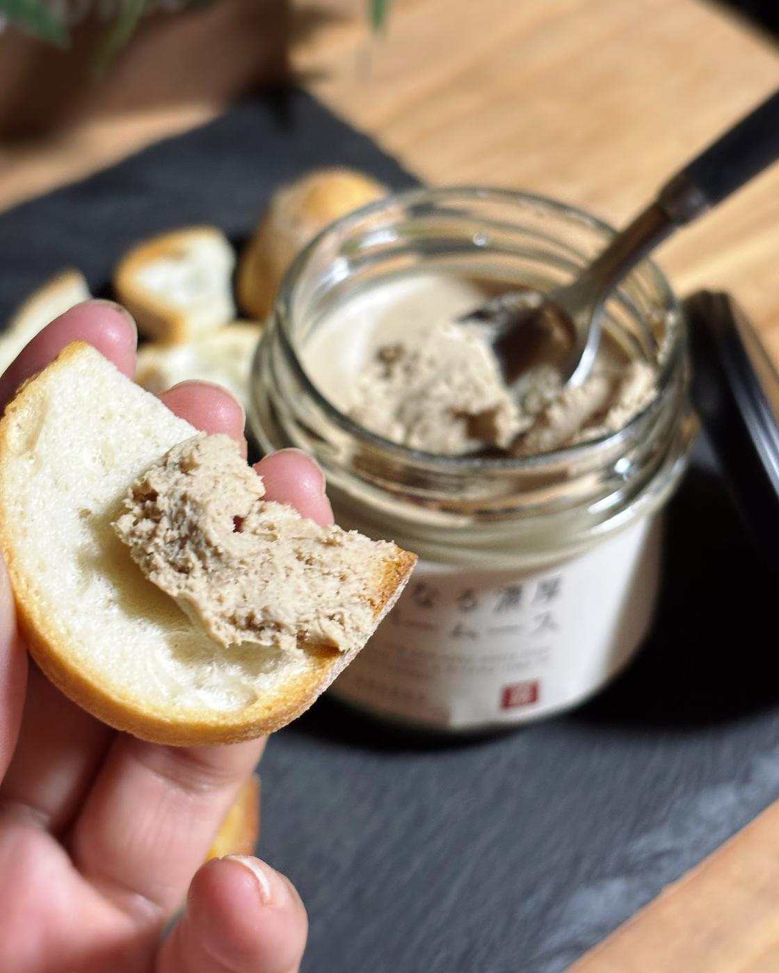 付属のバゲットにのせるとコクがより引き立ち、ドライフルーツを合わせると甘みと旨味のコントラストが楽しくお酒が進む味わいに🍷