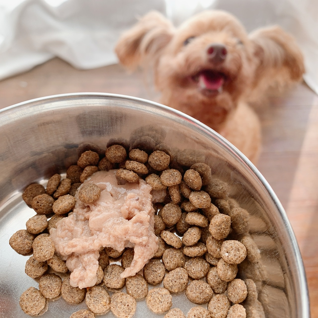 うちのわんちゃんはドッグフードに飽きちゃうのか、定期的にドックフードを食べてくれなくなる時期があるのですが、先日も朝ごはんを残していたので、こちらの鹿肉ペーストをトッピングしてあげると、バクバク食べてくれました。