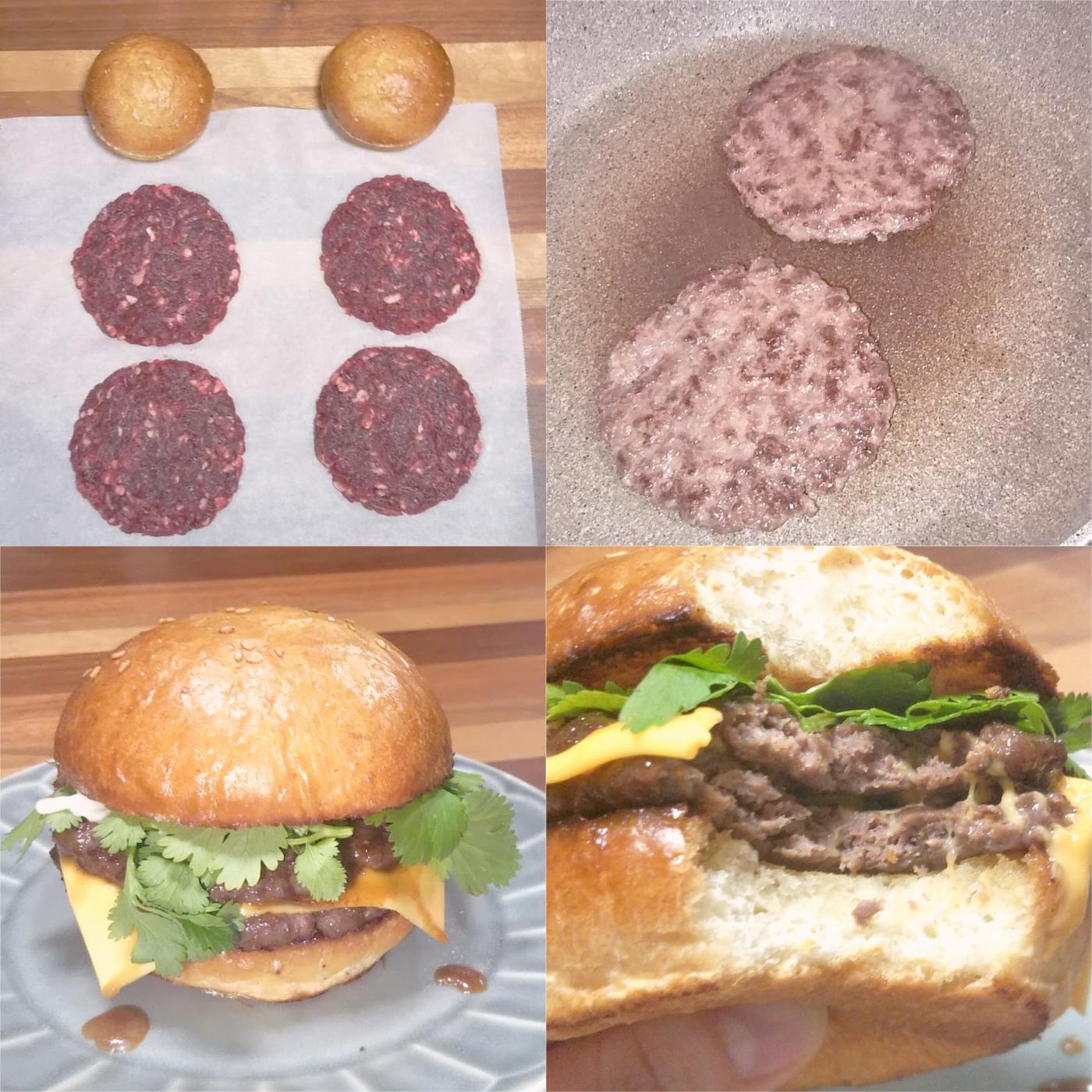 ⑥下からバンズ→パテ→チーズ→パテ→パクチー→マヨネーズ→フライパンに残った焼き肉のたれ(1人前あたり小さじ1程度)→バンズの順に挟めば完成です!