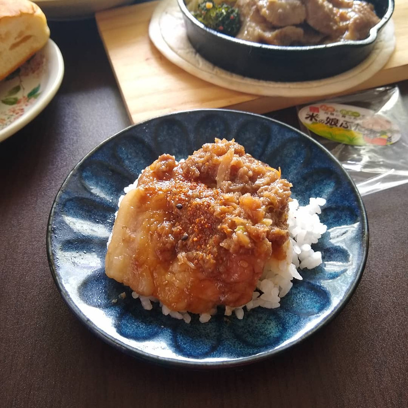 焦げ色が食欲をそそる。別添の舞茸ソースを乗せて食べます。