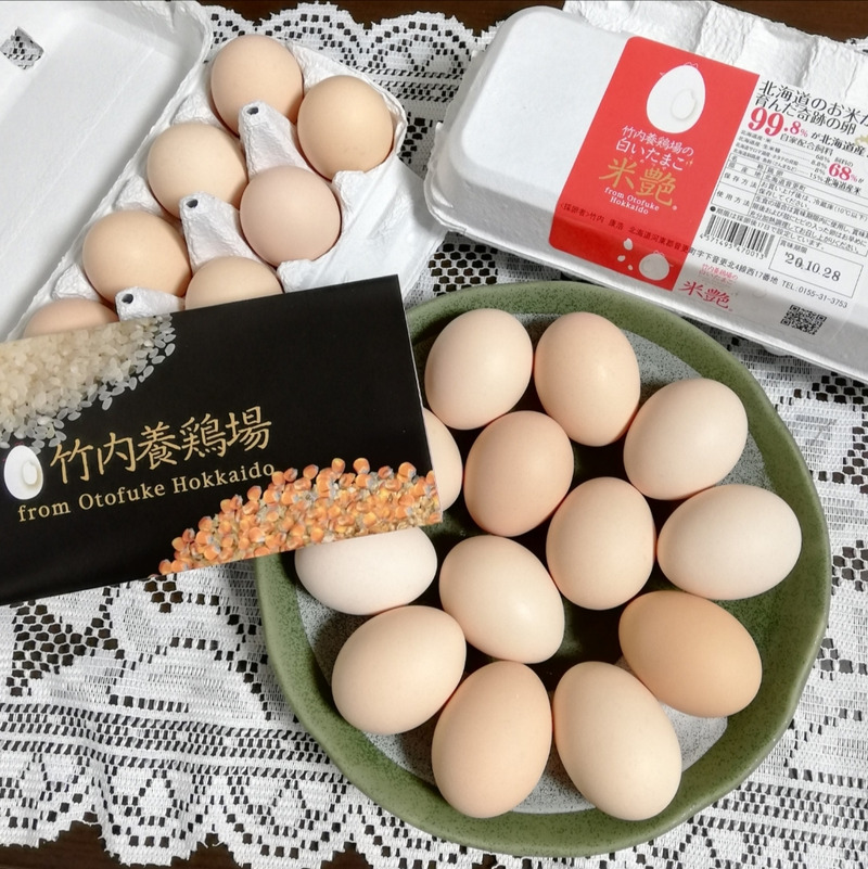 自家配合の北海道産飼料99.8%の卵です。 北海道産のお米を主原料としているので、黄身も白いんです! ...