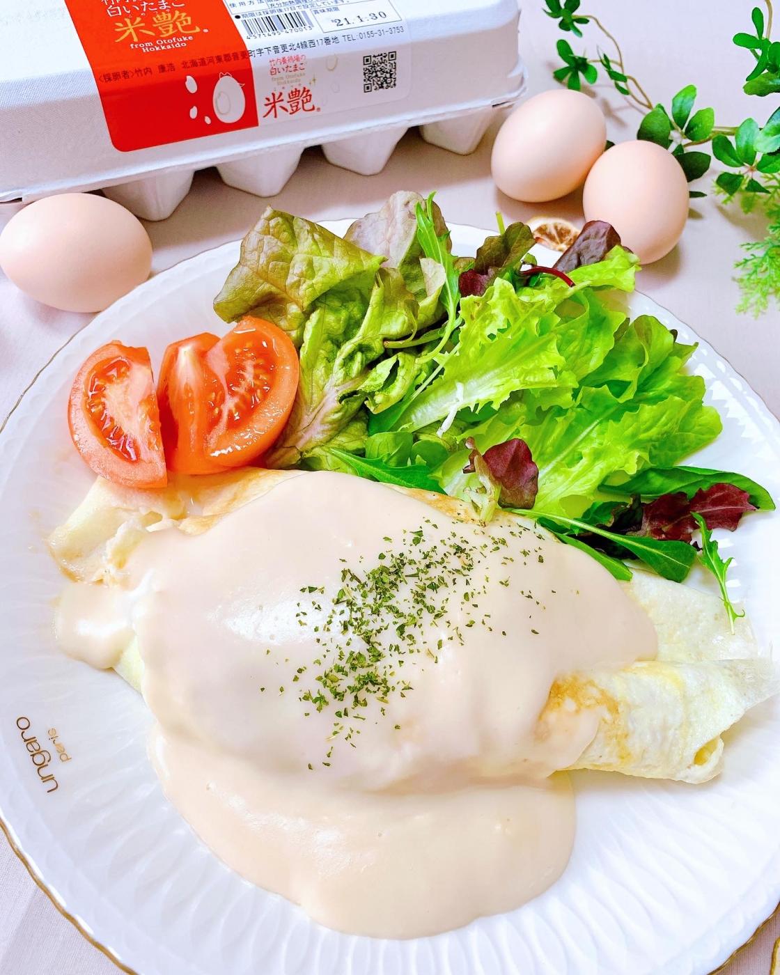 卵を巻く時ちょっと端が失敗…破れた部分をホワイトソースで隠して(笑)完成〜????