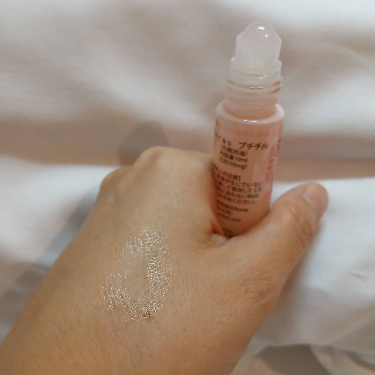 今回お試しした「コーラス プチチル」は、そんなCBDを手軽に使うことができる化粧用油。キャップを外すと、先端はコロコロとボール型になっていて、気になる部分に直接塗りやすいようになっています。