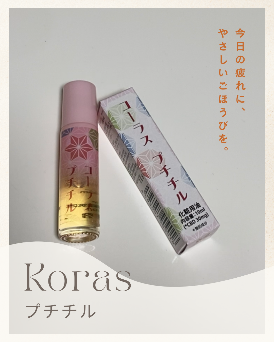 育児や家事に追われて、自分のケアがつい後回しになりがちな日々。その中で「毎日の小さなリセット時間」を作ってくれたのが、KorasのCBDロールオンオイル《プチチル》です。CBDというと、舌下に数滴垂らすタイプのものが主流ですが、私は味が苦手で続きませんでした。しかし、このプチチルは“塗るだけ”でCBDの整肌ケアを取り入れられるため、ストレスもなくとても使いやすいと感じました。