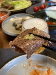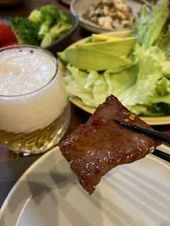 焼肉のタレで食べたり、わさび塩で食べたり、サニーレタスとキムチと焼いたズッキーニとともに巻いて食べちゃったり。。。