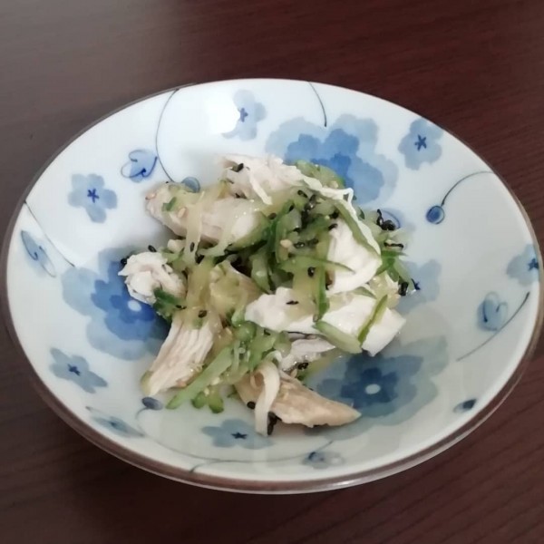 4、さいた鶏肉と絞ったキュウリを合わせて、調味料を混ぜて和える