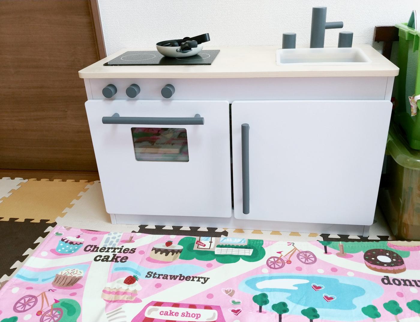 3歳になった娘の誕生日にキッチンをプレゼントしたので、キッチン用のプレイマットがないかと探していたところ【デスクマットCARPET】という商品がキッチンにぴったりだったので、早速使ってみました!