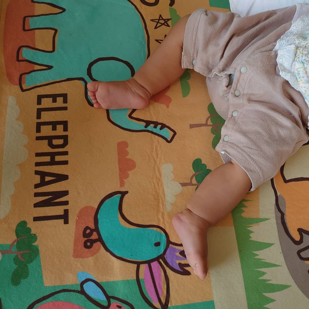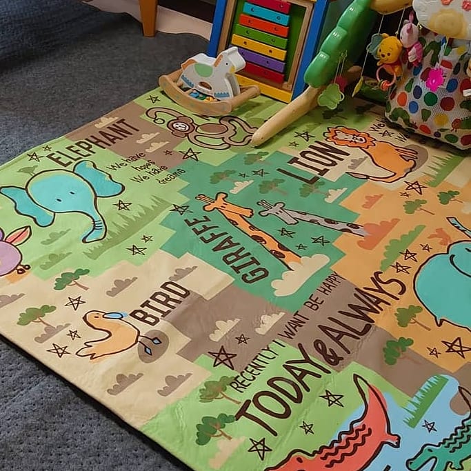 長女のデスクマットにと思って応募していましたが、机を買ったらデスクマットがついてきたのでプレイマットとして使用しています。