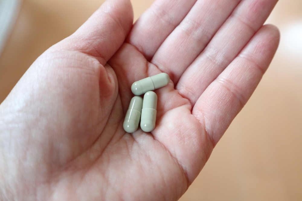 緑色のカプセルの中には緑色の粉がギュッと凝縮されて入っています。