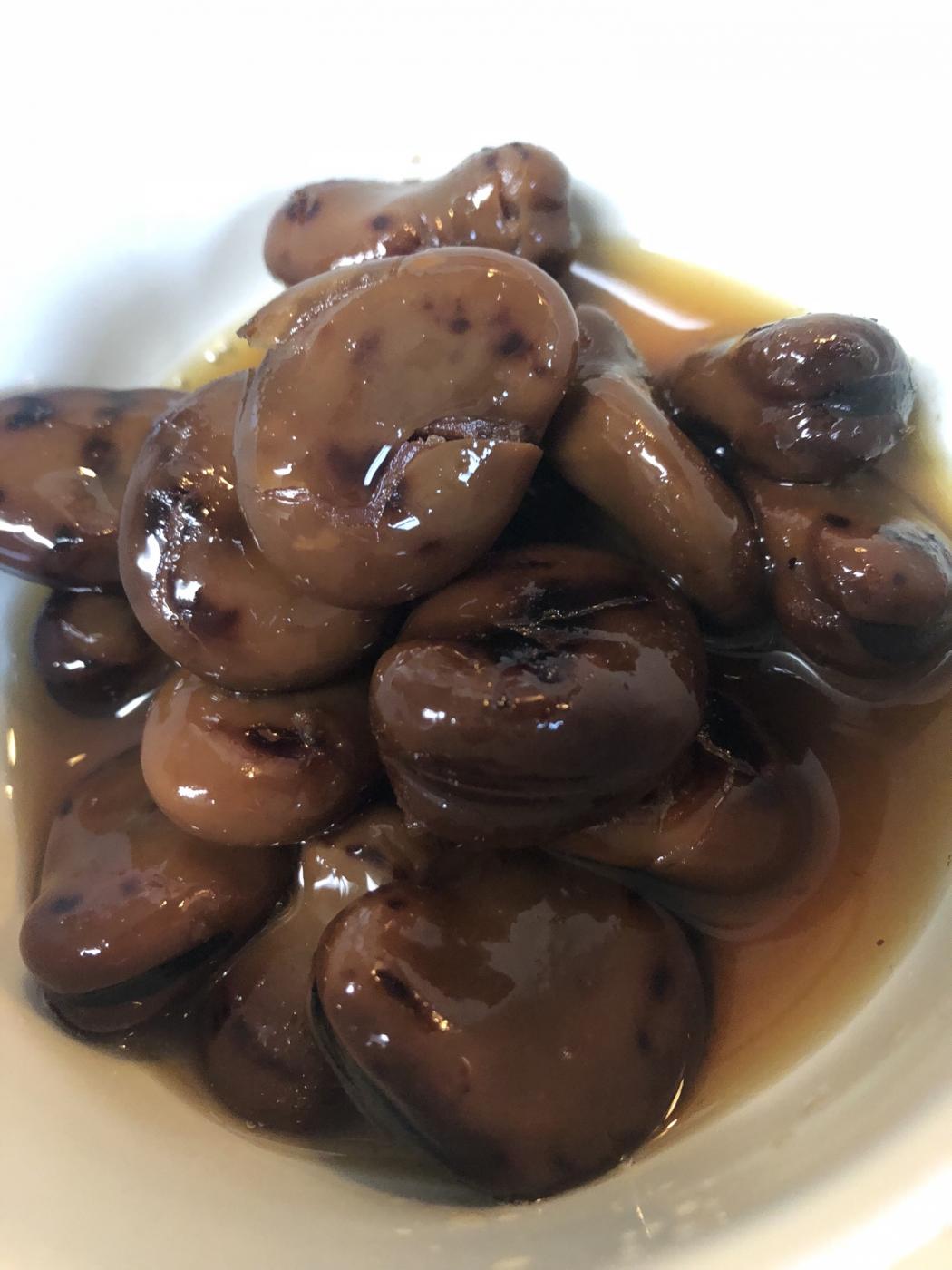 しょうゆ豆は、そら豆が使用されていて、よくスーパーで見かける緑色のそら豆は未成熟のものでそれではなく、しょうゆ豆に使うそら豆は畑で完熟させてから収穫し、天日干しさせた薄茶色の乾燥そら豆。この乾燥そら豆を時間をかけてこんがりと焙煎してから甘辛のしょうゆダレに漬けて調味したものがしょうゆ豆だそうです。しょうゆ豆を袋から出したとき、茶色かったのでしょうゆの色かと思ったんですが、もともと薄茶色だったのなら納得です。