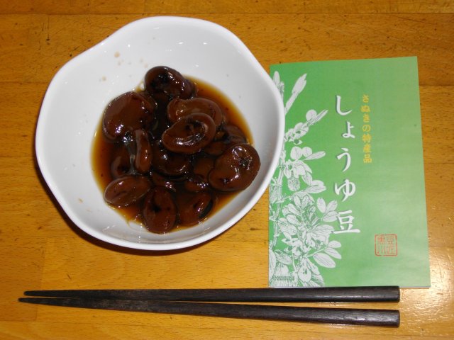 しょうゆ豆のリーフレット(説明書)を見て、その出来方や成り立ちを知ることができました。四国八十八か所を巡るお遍路さんに「お接待」てして提供していた乾燥そら豆を炒っているとはじけた豆が醤油の壺に飛び込んでしまったというものだそうです。これがことのほかおいしかったのがルーツという説明でした。