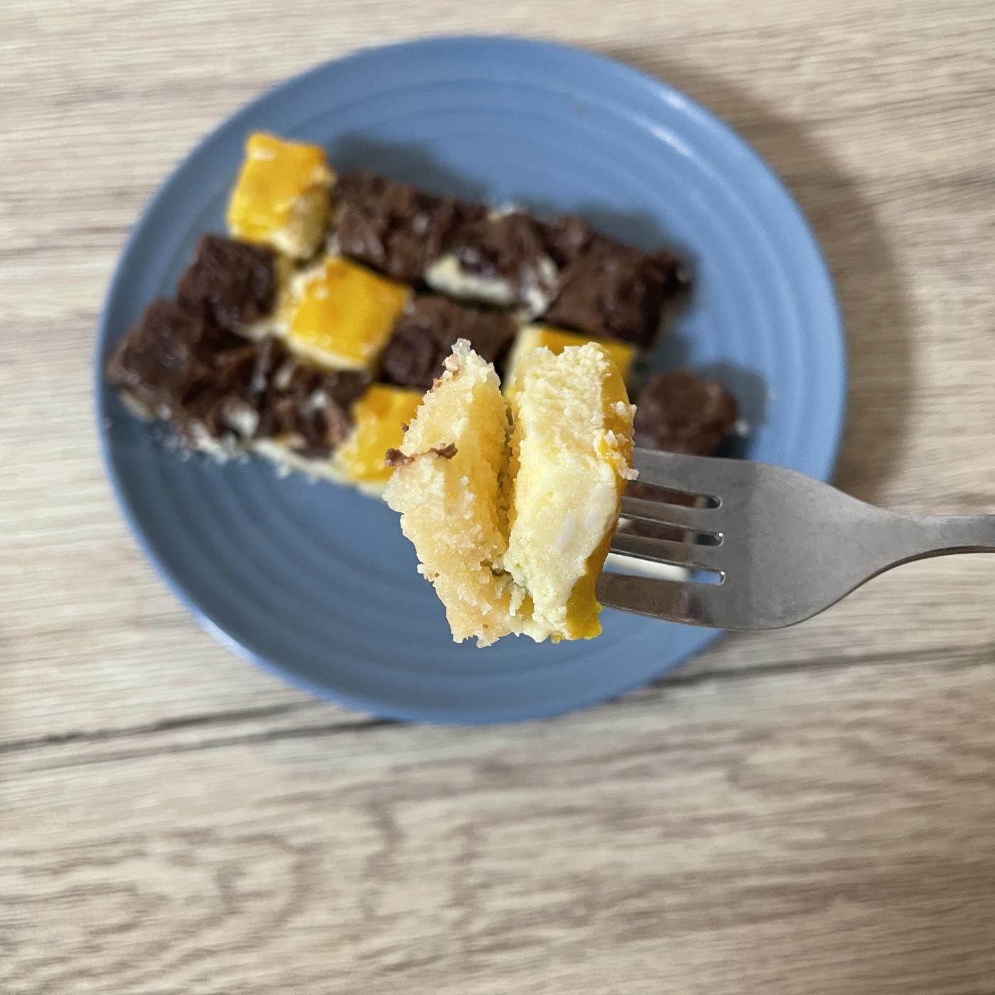 チーズケーキの生地にマンゴー果汁を混ぜ合わせ成形し、その上部にマンゴーをトッピング💗