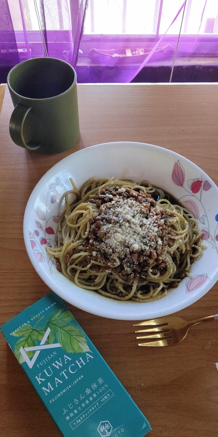 糖化を防ぐ手助けをしてくれるという、ふじさん桑抹茶を使ったパスタレシピを使ってみました。まず、お水に溶かして飲んでみましたが、クセもなくとっても飲みやすく、溶けやすかったです。色もキレイなグリーンで、いかにもカラダに良さそうです。さて、パスタですが、ニンニクたっぷりをこんがりと炒めて焼いて、納豆もたっぷりいれて、カラダにいい栄養バランスの桑抹茶も入った、おいしい和風のパスタでした。抹茶をパスタに使ったのは初めてでしたが、とてもおいしくて、またリピートしたいなと思いました。お料理の味を邪魔しないふじさん桑抹茶、ほかのお料理でもおためししてみたいなぁと思いました。次は何に挑戦しようかなと考え中です。
