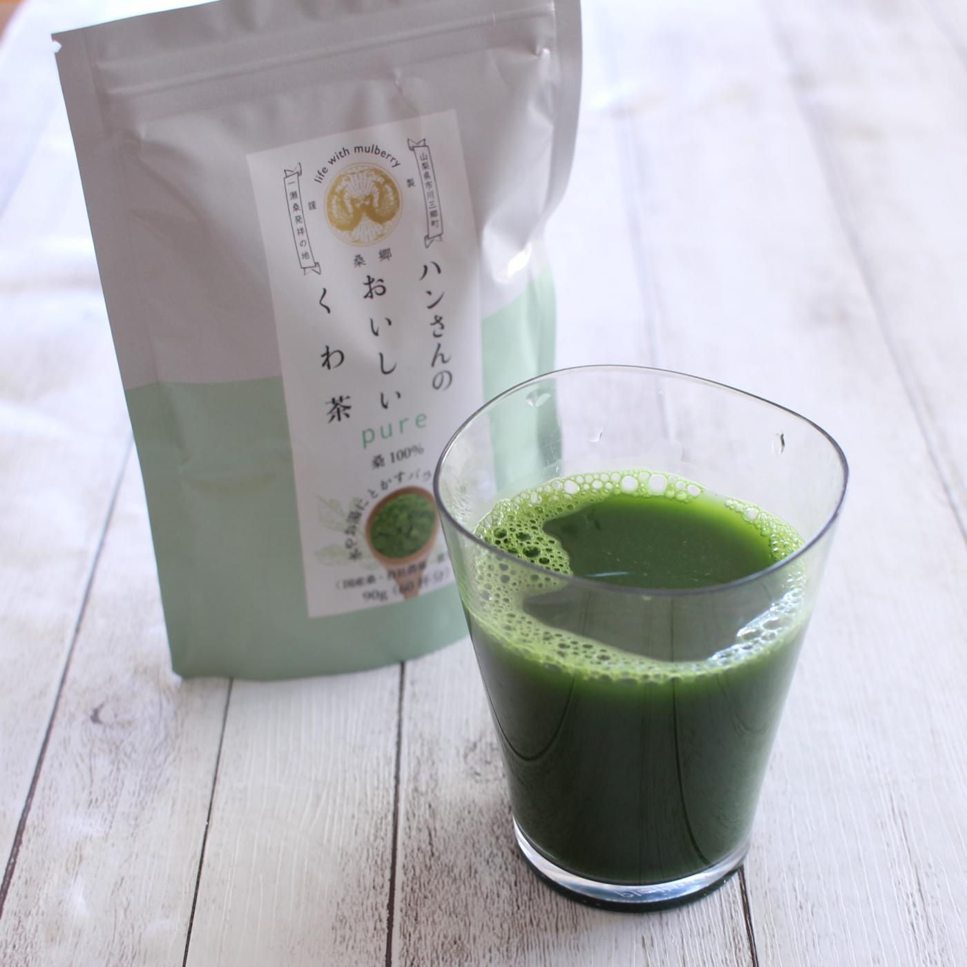 ハンさんのおいしいくわ茶は山梨県市川三郷町産の桑葉を100%使用したお茶パウダーです。