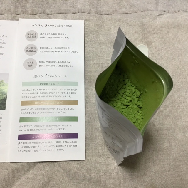 選べる4つの桑の葉茶から、今回は100%桑の葉をパウダーにしたピュアを