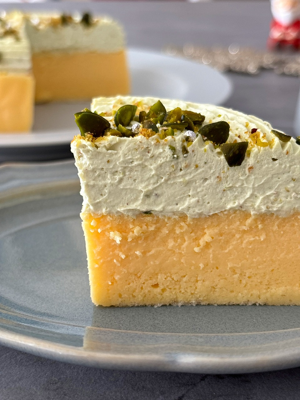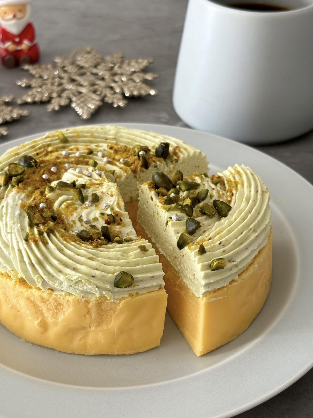 1口食べるとしっとり滑らかで、濃厚なチーズケーキとたっぷりのピスタチオクリームに至福のひととき。