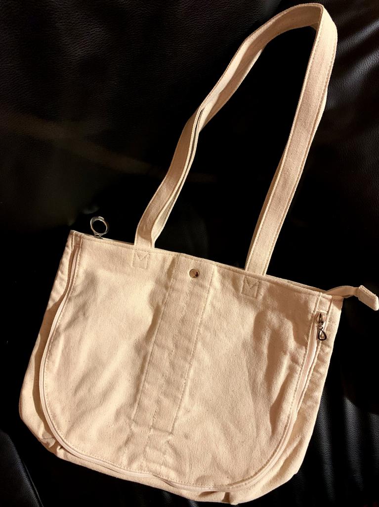薄い本もゆうゆう入る大きさ、程良いマチ。しっかりした生地だから沢山買っても安心。