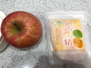りんごをすりおろして、ポットのお湯で少量のとろみの精をといてりんごと混ぜて冷やすと簡単ゼリーの出来上がり!