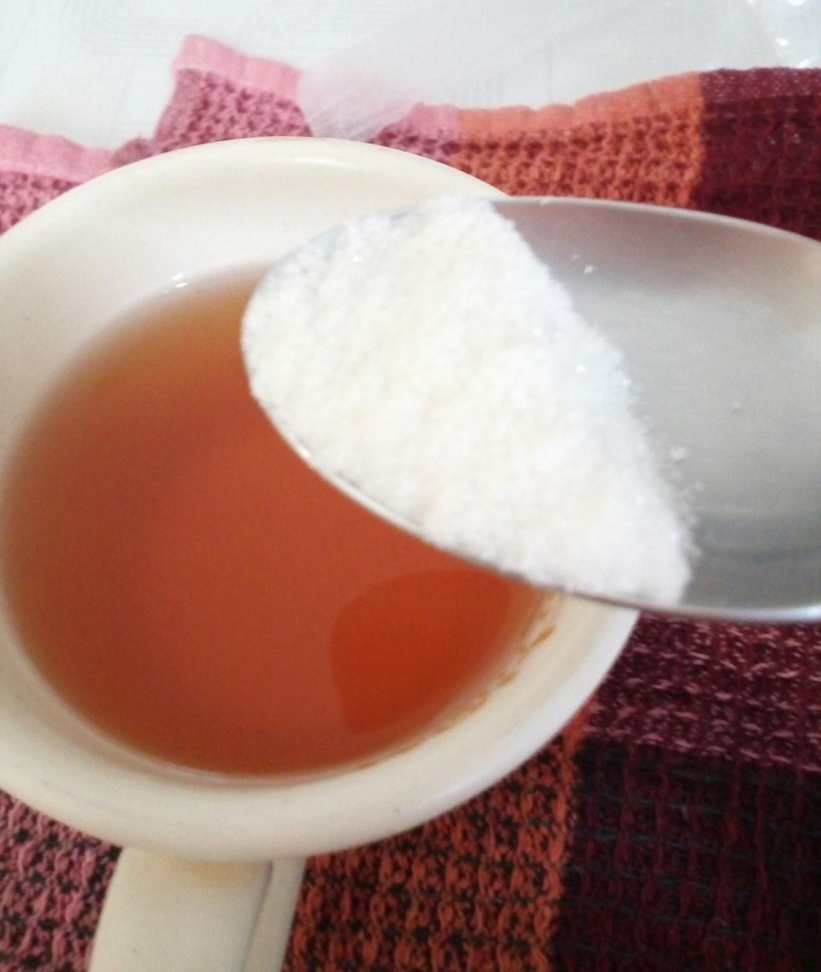 2、砂糖大さじ1〜2杯、とろみの精大さじ1〜1.5杯を入れてよく混ぜる