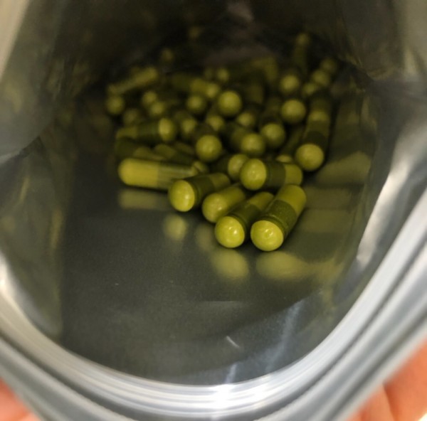 濃い緑色 と薄い緑色の二色の細長いカプセルタイプです。