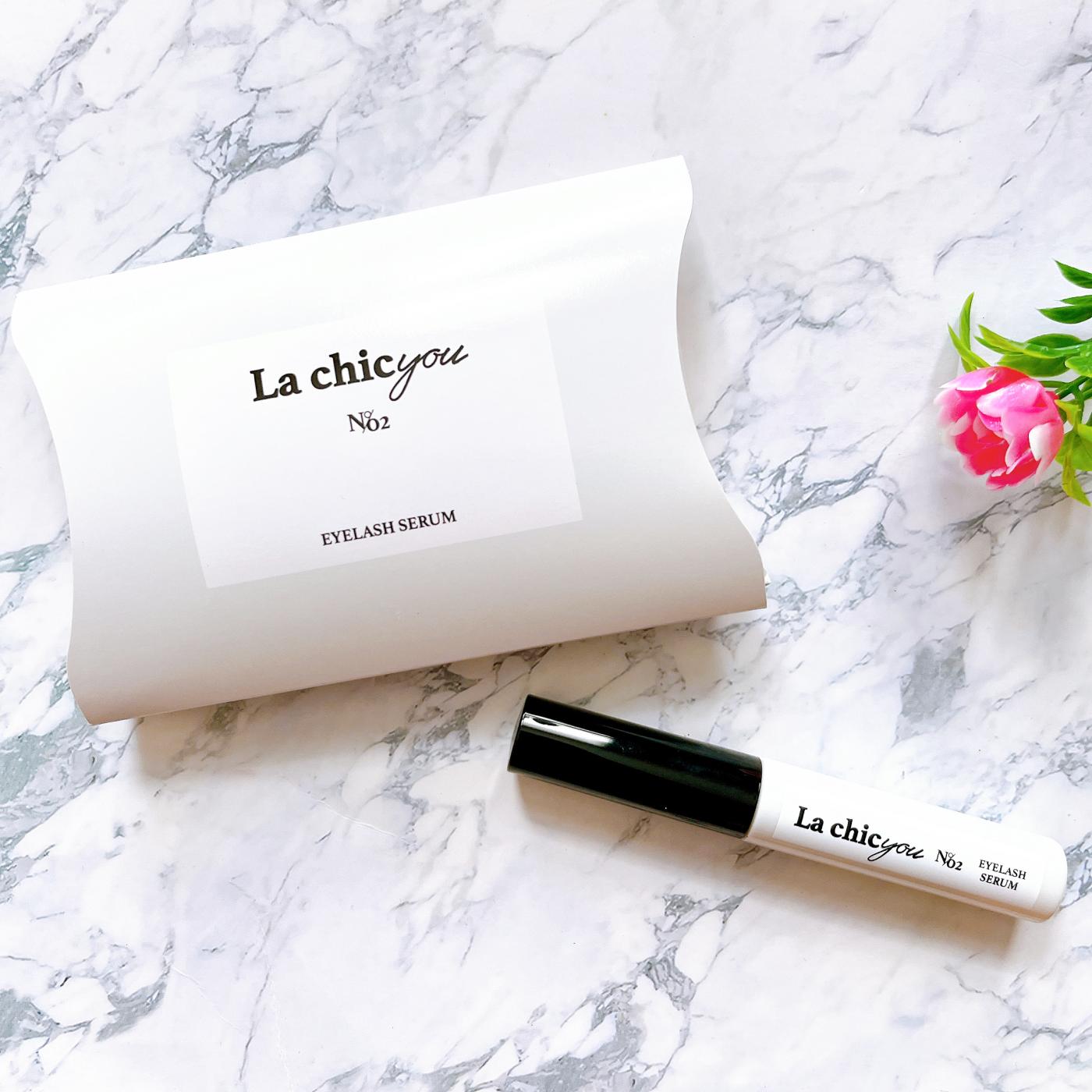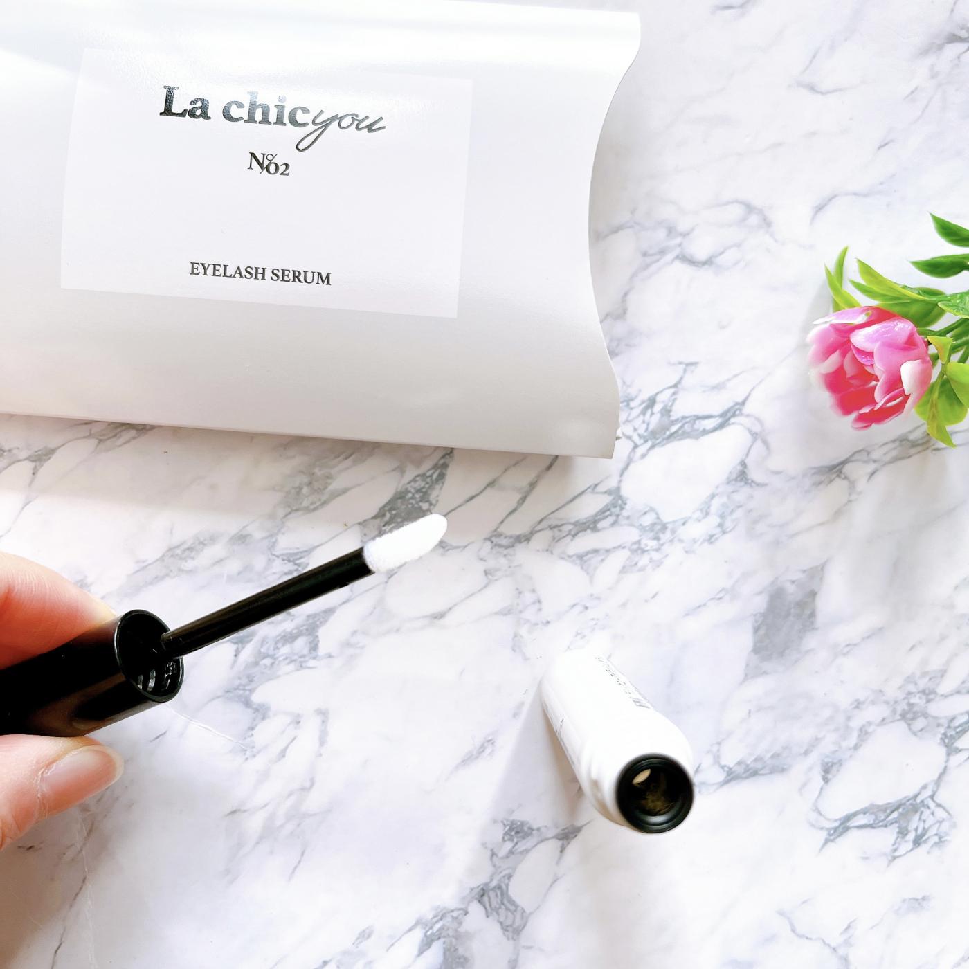 La chicyouのアイラッシュ セラムのレビューです。 ホワイトとブラックのスッキリしたデザインのまつ毛...