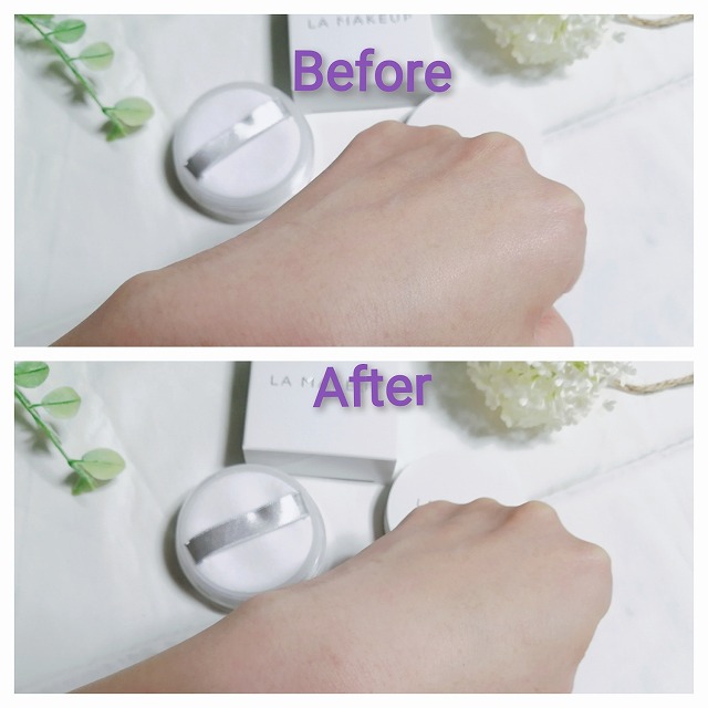 パフを肌の上でスライドさせると薄く付き、ポンポン押し乗せるように付けるとたっぷり目に付きますので、パフの使い方で微調整して伸ばすとムラなく塗れますよ✋