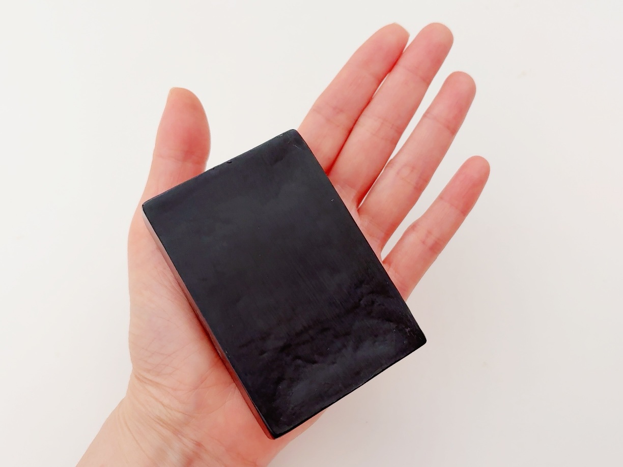 枠練り製法でつくられた真っ黒い石けんは、とてもキレイです。