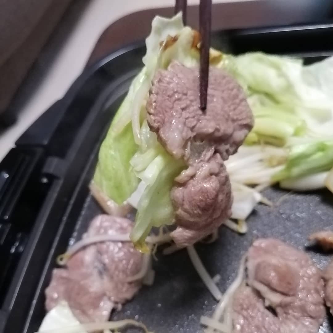 生ラム肩ロース+タレだっちゃセットが焼けて、お野菜もいい感じにしなってきたら、たれにたっぷりとつけていただきます