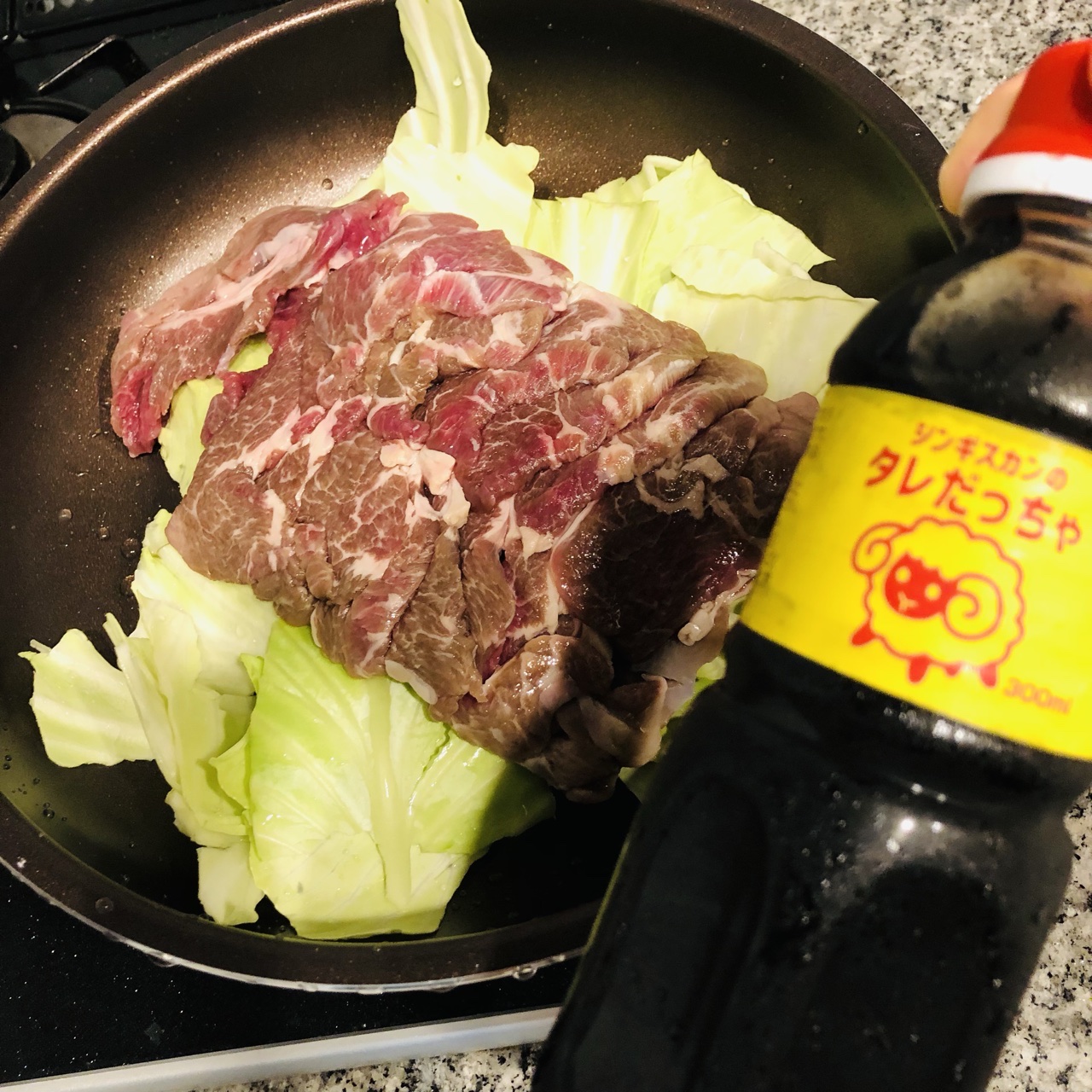 キャベツともやしの上にラムをのせてフライパンで焼き、タレを回しかけて炒めてたべました。