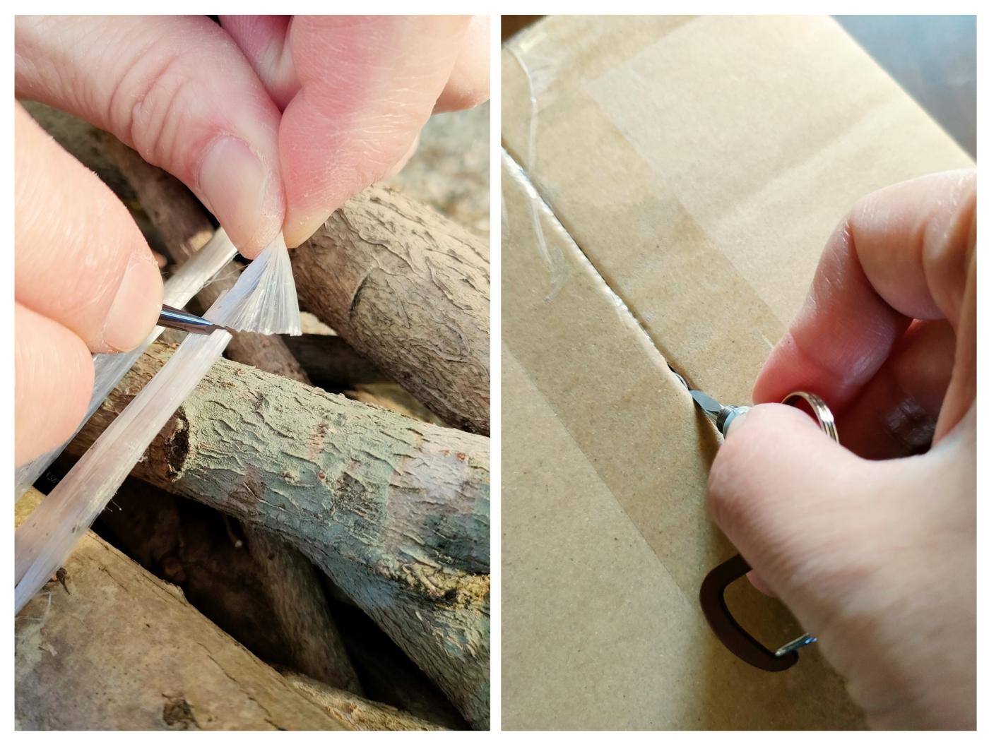 ロープや革も切ることができる鋭い切れ味、とのこと。キャンプでは薪に巻いてある固いテープや袋などを切ることもあるので助かります。写真はビニール紐ですが、スパッと切れました。