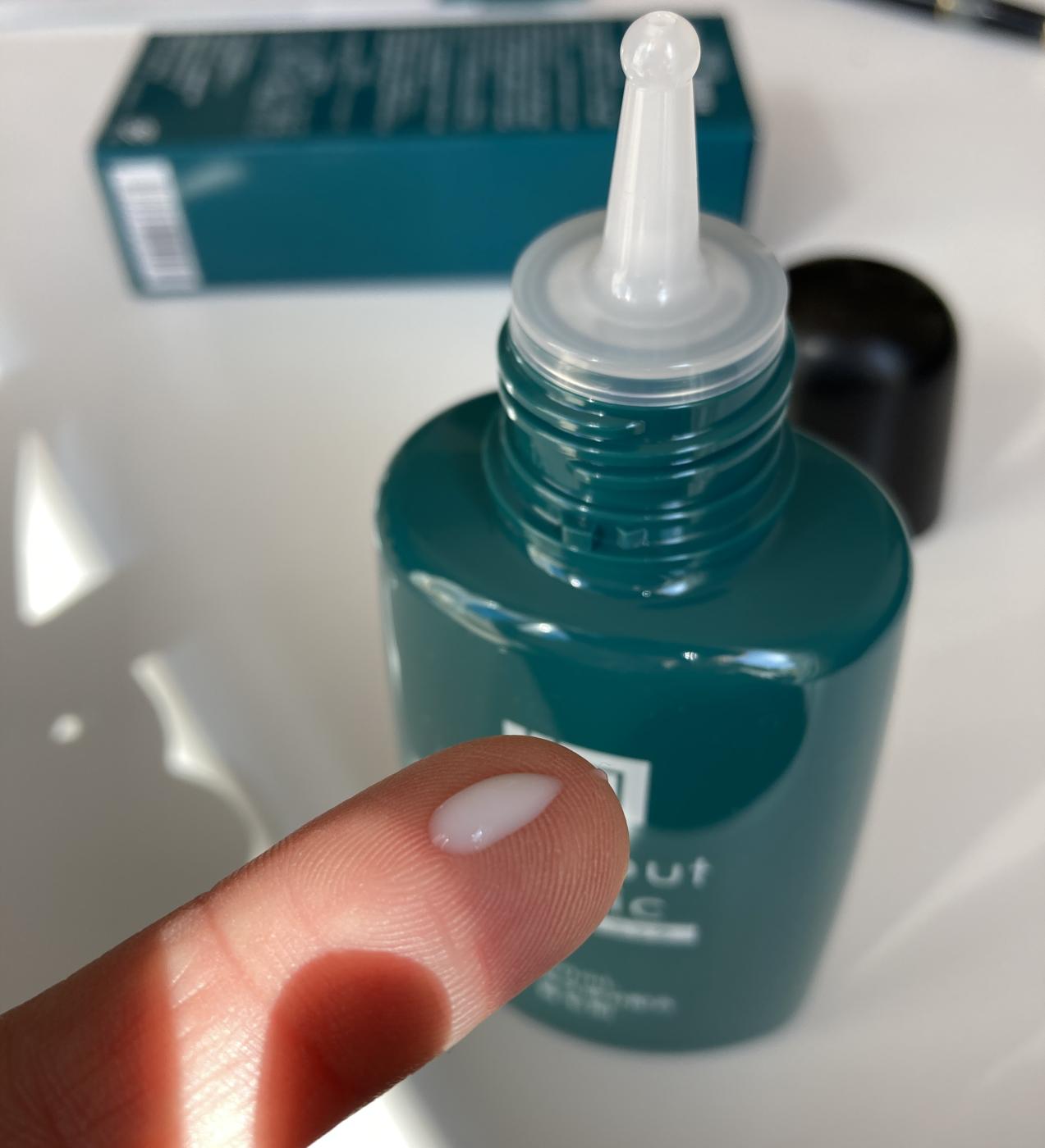 ボトル式になっていて、この黒い蓋を開けると、先端が細くなっており、横をちょっと押すと白くてさらっとした液体がでてきます。