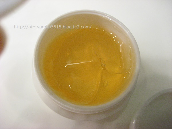 さて、ジャーを開けてみるとヘラと、ヘラを収納できる内蓋が付いていました。これで衛生的に使用できますよ。そして、中野ジェルはこのようにオレンジっぽい色味をしており、とってもフローラルな香りがしてきました。胡蝶蘭の香りかしらね。ものすごくいい香りなの。思わずスキンケア中にうっとりしてしまうほど。