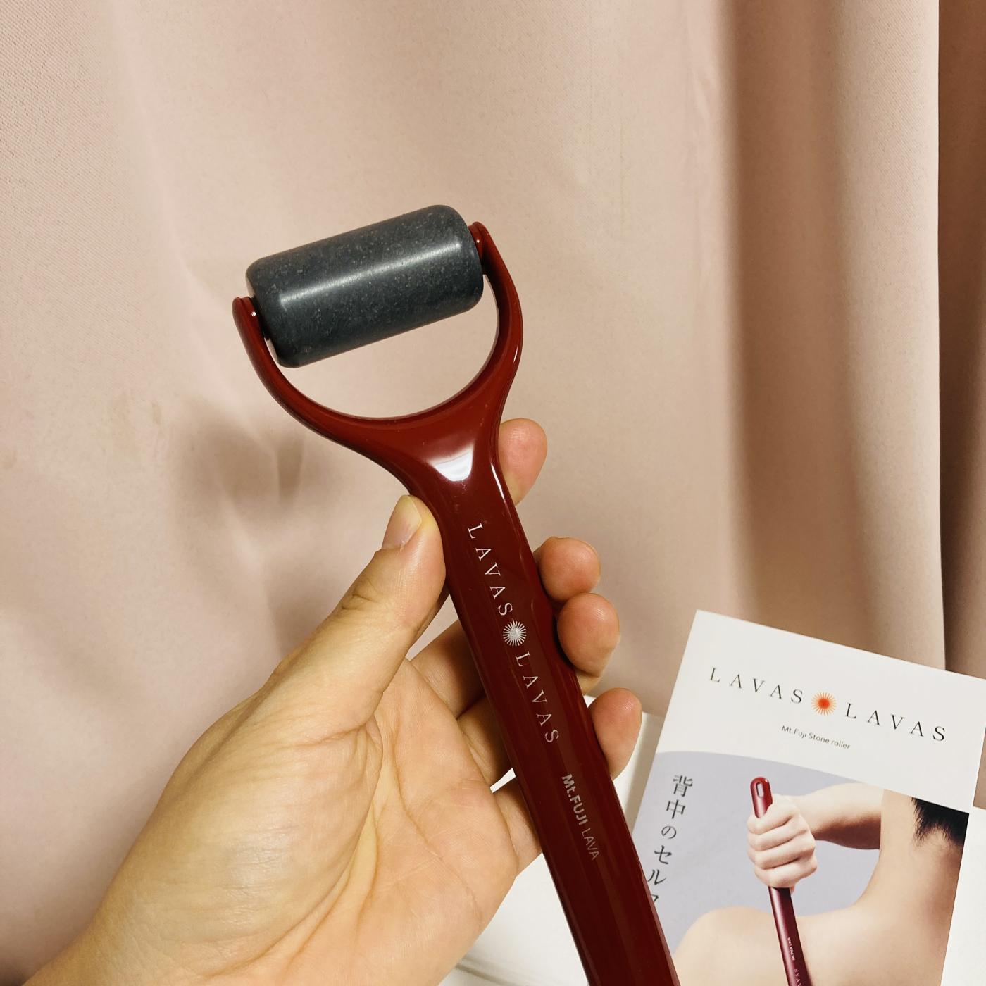 そして、この柄の先についているのは??富士山の、天然の溶岩なんだとか。入手困難なのでレアで素敵ですね。届きにくい背中までもローラーしやすい!魅力のアイテムですね。背中に届く!これ、すごく楽ちんに背中をマッサージできました。鍼灸師、アロママッサージの先生と一緒に開発されたんだとか。これは期待できますよ。