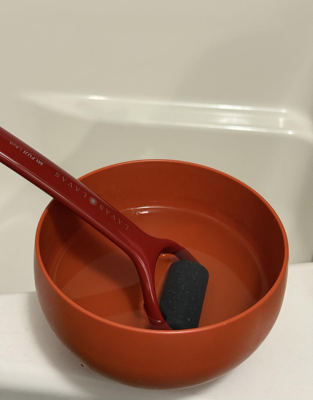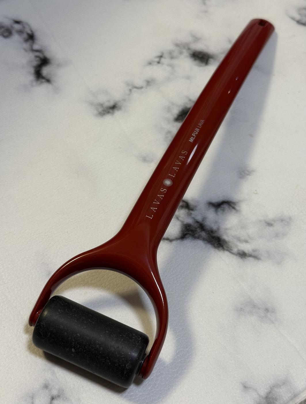 ローラー部分は富士山の溶岩でできています。一時期溶岩の岩盤浴にハマっていた時期がありました。他の石よりも熱の浸透が良いと感じていたので、期待通り このローラーも60度ほどの湯に浸し、体に当てると…