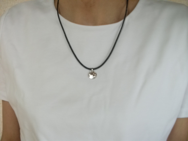 まるで小さなコインのような可愛いデザインのペンダントで、色は銀色です。首に下げるためのゴム紐が付いていたのですぐに使用する事が出来ました。