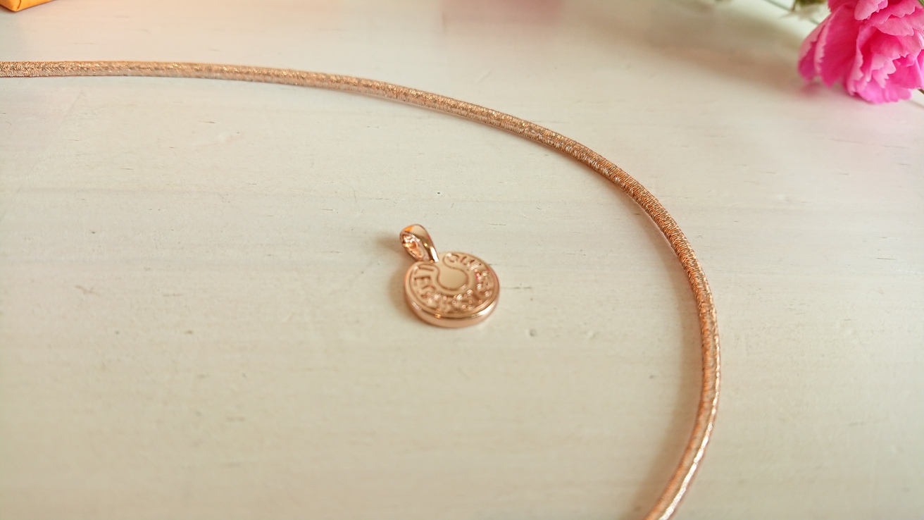 本品は、カラーがシルバーとピンクゴールの2種類、形もリングタイプとペンダントタイプの2種類があり、今回縁あって届いたのはピンクゴールドのペンダントタイプです。