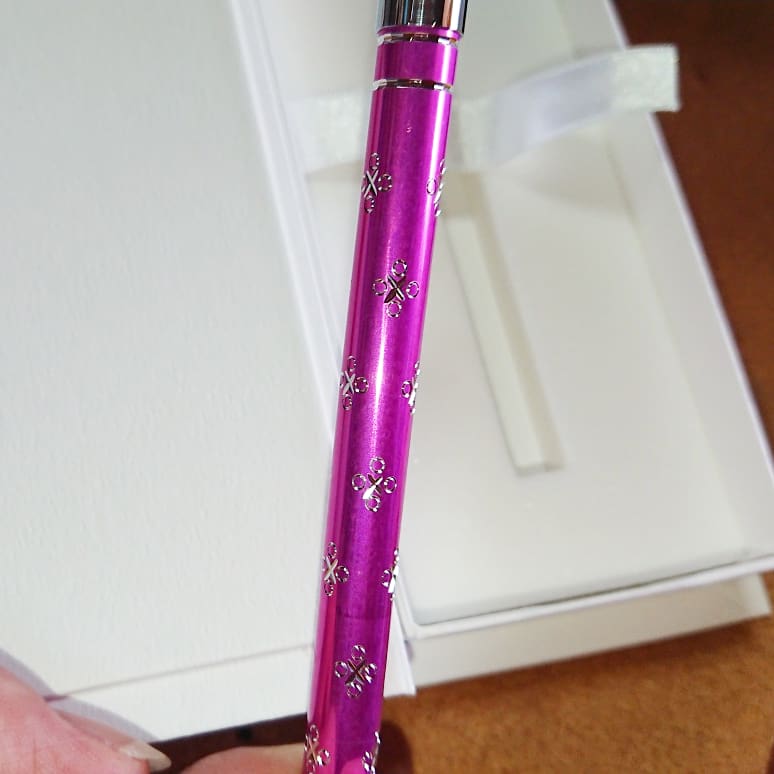 実はあたしが選んだ色〈C:ツツジ色〉に、あたしが選んだ和柄〈10:蝶〉が彫刻されている、世界で無二のタッチペンなの\( ¨̮ )/