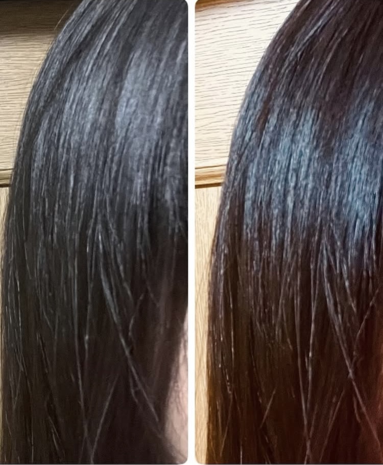実際に使ってみると、1回目ではうっすら色が入った程度でしたが、3回ほど続けて塗布すると自然なダークブラウンに。いかにも染めました、という感じではなく、白髪がふんわり馴染む仕上がりでとてもナチュラルです。髪がしっとりまとまり、パサつきが気にならなくなるのも好印象でした。トリートメントとして優秀なので、ケアしながら白髪対策できるのは嬉しいポイントです。